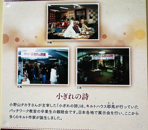 而在“耶马”也开始增加拚布的课程,为了把拼布让更多人可以学习,她们是第一个做通讯教学的教室,后来慢慢地学习拼布的人愈来愈多之后,成立了一个《小ぎれの诗》(小碎布之诗)的社团。