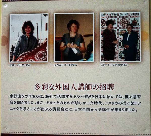 在这个社团里,大家一起为拼布教学,展会,做出很大的贡献,小野山タカ子自己几次到海外去学习新的技术,同时也把美国拼布大师,邀请到日本来做教学,这是在日本的创举,由于这样的方式,造就出了很多大家熟悉的大师。
